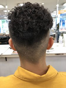 上の部分はパーマをかけてもすぐとれてしまうみたいなので、グルングルンに強くかけて、ウェットの状態とドライの状態でもパーマ感が出るようにかけ、バックとサイドは、1番短い長さからスタートし、上の高い所まで刈り上げたフェードスタイルにしました!