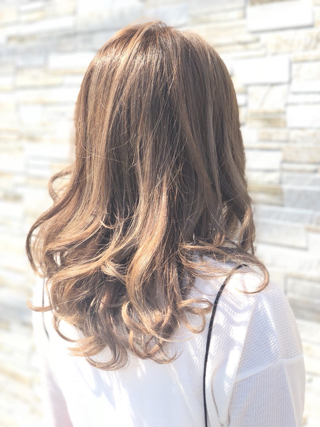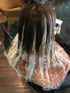 細めの毛束をとり明るくしていくハイライト、
