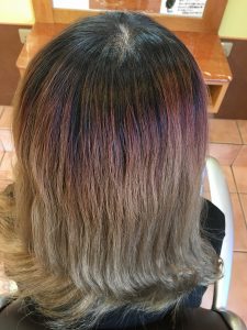 毛先の色に近づけるため根元の黒い部分を2回ブリーチして色を抜きました!